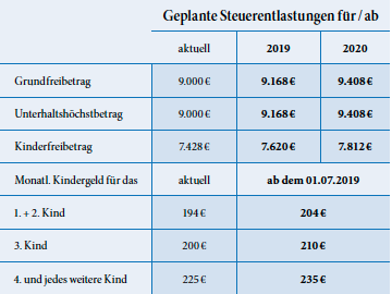 Anpassungen wird es ebenfalls beim Kindergeld geben, das ab Juli 2019 um 10 Euro und ab Januar 2021 um weitere 15 Euro angehoben werden soll. Der Kinderfreibetrag wird entsprechend angepasst. Dieser wird bei höheren zu versteuernden Einkommen anstelle des Kindergeldes gewährt. Den Eltern wird zunächst monatlich Kindergeld ausgezahlt und bei der Einkommensteuerveranlagung wird von Amts wegen geprüft, ob der Kinderfreibetrag eine höhere Entlastung als das Kindergeld ausmacht. Ist dies der Fall, wird der Kinderfreibetrag steuermindernd berücksichtigt und die bereits erhaltenen Kindergeldzahlungen gegengerechnet.